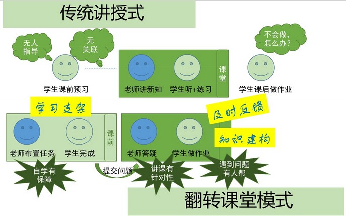 翻轉課堂(The Flipped Classroom ),又翻譯為“反轉課堂”或“顛倒教室”,2011年在美國各地興起的“翻轉課堂”,很快就吸引了多方的關注。這種新型的教育教學形式,顛覆了傳統意義上的課堂教學模式,也讓處于課程教學改革膠著狀態的人們看到了課堂改革的新希望。傳統的教學模式是老師在課堂上講課,布置家庭作業,讓學生回家練習。與傳統的課堂教學模式不同,在“翻轉課堂式”教學模式下,學生在家完成知識的學習,而課堂變成了老師學生之間和學生與學生之間互動的場所,包括答疑解惑、知識的運用等,從而達到更好的教育效果。互聯網的普及和計算機技術在教育領域的應用,使“翻轉課堂式”教學模式變得可行和現實。學生可以通過互聯網去使用優質的教育資源,不再單純地依賴授課老師去教授知識。而課堂和老師的角色則發生了變化。老師更多的責任是去理解學生的問題和引導學生去運用知識。