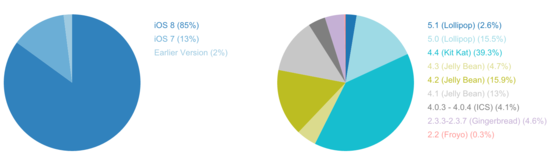 盡管越來越多的制造商對軟件開發者來說可能不是好事,但對碎片化的抱怨日益消失是有原因的。安卓用戶逐漸集中在幾個最近發布的系統版本上,57%的設備在運行KitKat或更新的版本。91%的設備運行Jelly Bean或更新的系統。但和iOS的狀況比起來,安卓的成績就不算很好了。最新的iOS 8系統運行在超過85%的設備上。
